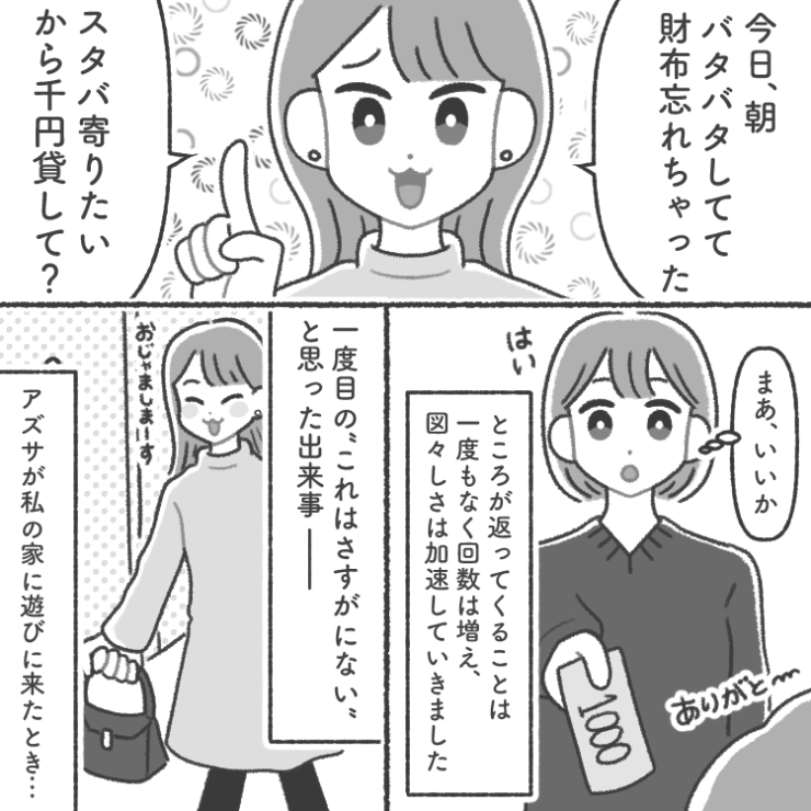 OTHER 2026.01.10「この封筒、給料下ろしたやつ?借りるね!」私の家に遊びにきて、机の上においてあった家計のお金を奪おうとする友達!これまでにも数万円貸したのに1円も返金なしなので・・・衝撃のエピソードを漫画化!今回は会うたびに「お金を貸して」と言ってくる超非常識な友達のお話をご紹介します。主人公の学生時代からの友達のアズサは最近よく「お金を貸して」と頼んでくるようになったようで・・・。123#漫画