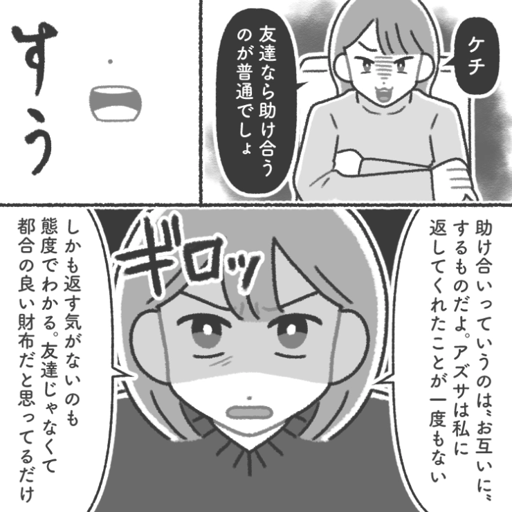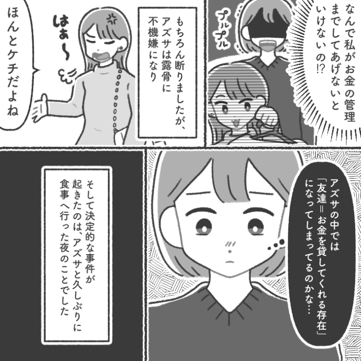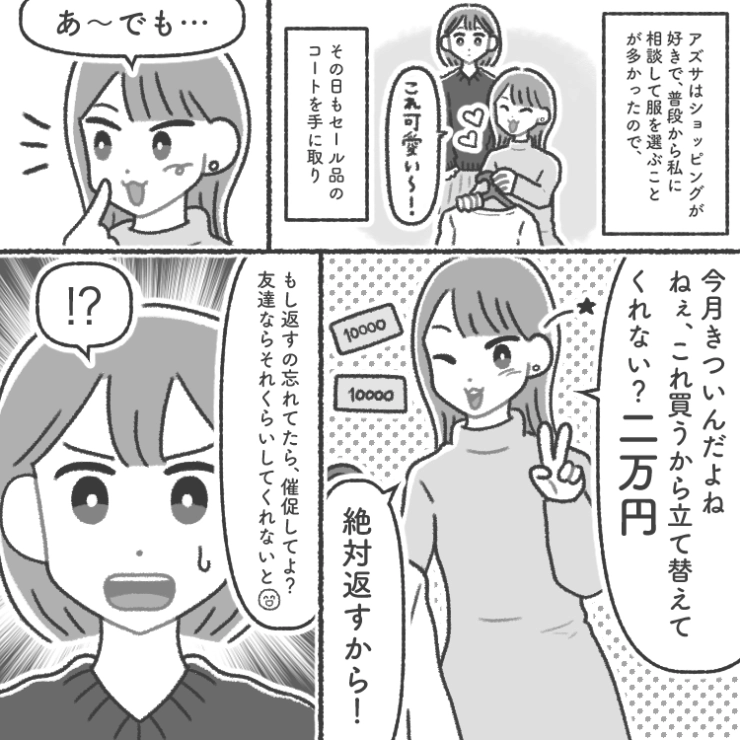 主人公の学生時代からの友達のアズサは最近よく「お金を貸して」と頼んでくるようになったようで・・・。