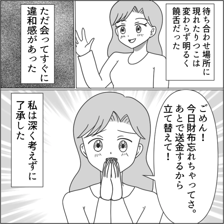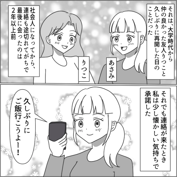 主人公には大学生からの友達がおり、この日久しぶりの再開を喜んでいました。しかし、気になるところがあり・・・。