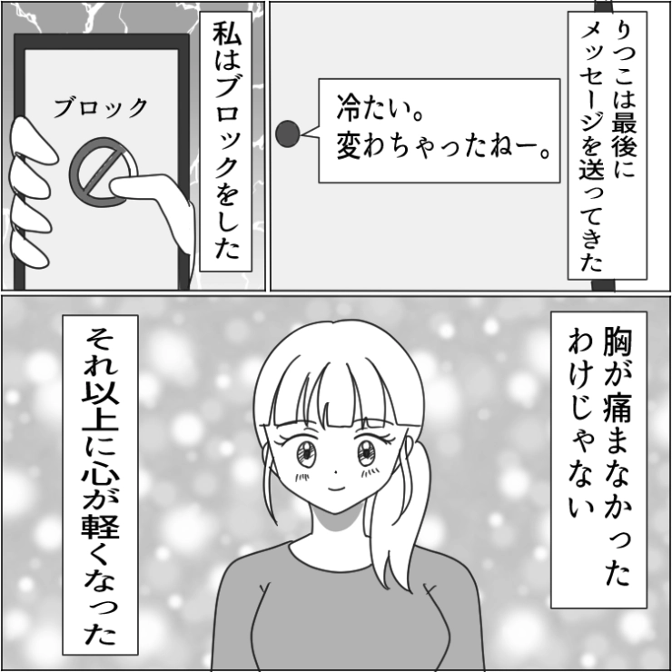 彼氏に言うと言った途端態度を急変させてきたリツコ。あわよくばたかろうとしていた態度に呆れるばかりの主人公でした。