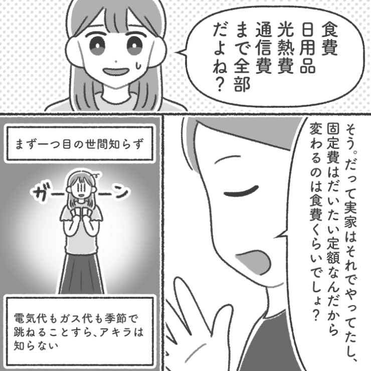 OTHER 2026.01.24「月4万円以上使うなら自分の貯金から出せ」自分は節約上手だと思い込んでいる世間知らずな夫からの要求!あまりに無茶すぎることを言うので同じ条件で家計を任せたら・・・衝撃のエピソードを漫画化!今回は生活費は月4万でやりくりしろと言うくせに毎日デザートやコーヒーを買ったり、単価が高い食品ばかり買う世間知らずな夫のお話をご紹介します。結婚後、一緒に生活を始めたときに主人公の夫、アキラは無茶や要求をしてきました。アキラには少々世間知らずなところがあって・・・。123#漫画