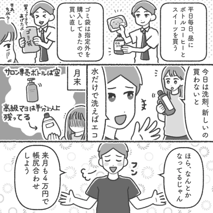 OTHER 2026.01.24「新婚だから贅沢したい!でも、生活費は4万円まで!」自分は節約上手だと思い込んでいる世間知らずな夫からの要求!あまりに無茶すぎることを言うので同じ条件で家計を任せたら・・・衝撃のエピソードを漫画化!今回は生活費は月4万でやりくりしろと言うくせに毎日デザートやコーヒーを買ったり、単価が高い食品ばかり買う世間知らずな夫のお話をご紹介します。「月4万円以上使うなら自分の貯金から出せ」自分は節約上手だと思い込んでいる世間知らずな夫からの要求!あまりに無茶すぎることを言うので同じ条件で家計を任せたら・・・1234#漫画
