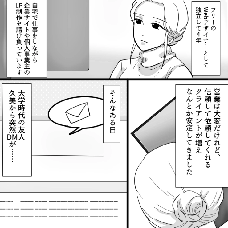 主人公はwebデザイナーとして働くアラサー女子。ある日、大学時代の友達から久しぶりに連絡がきて・・・。