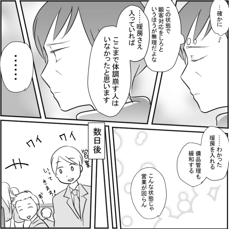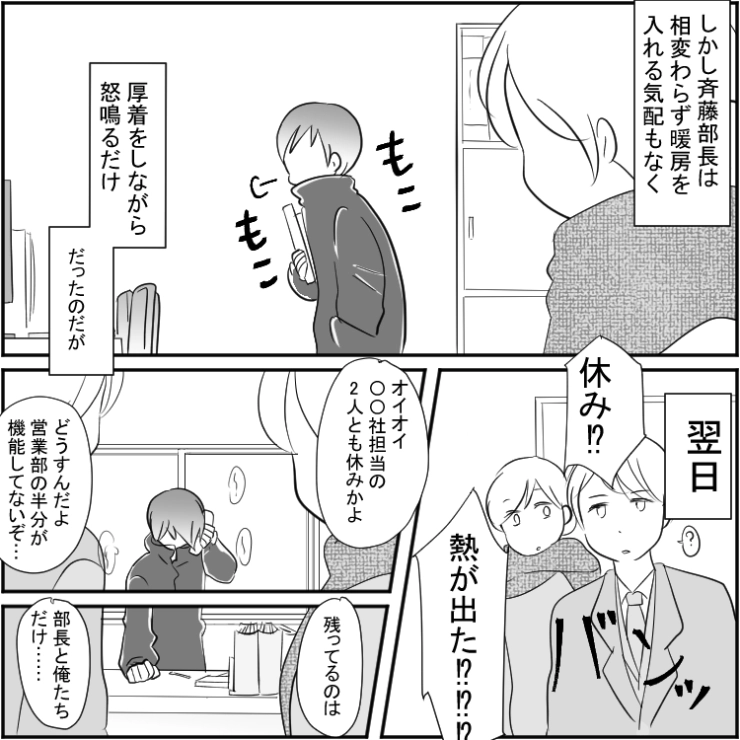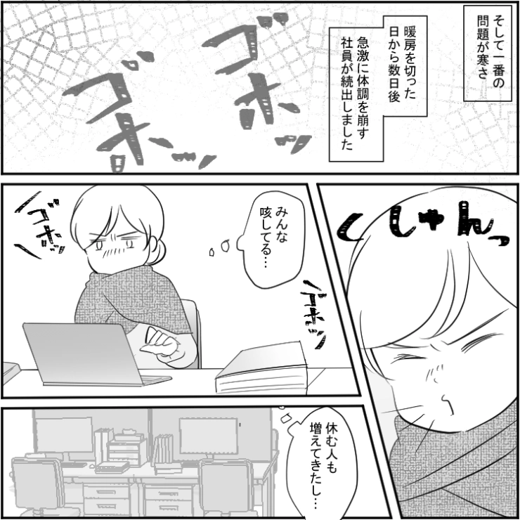 「電気代の無駄だから暖房禁止」経費削減という理由で暖房を一切つけさせない上司!体調不良者が続出し、業務がストップ→ついに取引先からお怒りの電話が入り、部長は・・・