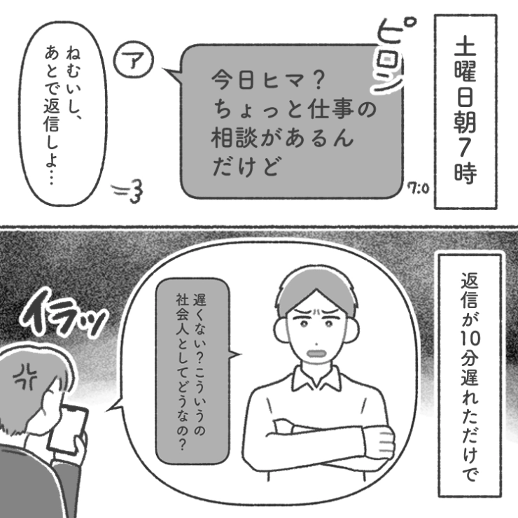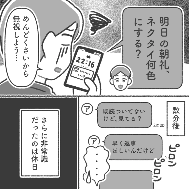 OTHER 2026.02.07「ネクタイの色どれがいいかな?」「返事ないけど非常識じゃない?」休みの日も即レスを強要してくる同僚!1時間携帯を見なかったら20件以上の連絡が→同じこと仕返したら・・・衝撃のエピソードを漫画化!今回は休みの日にも大量に連絡してきて即レスを求めてくる同僚のお話をご紹介します。123#漫画