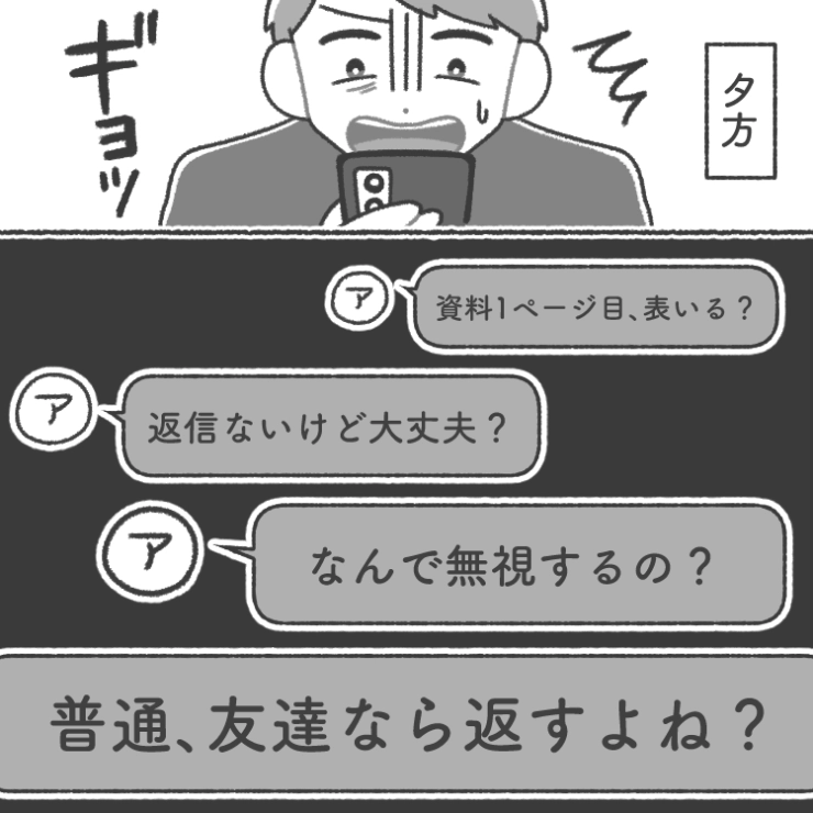 衝撃のエピソードを漫画化!今回は休みの日にも大量に連絡してきて即レスを求めてくる同僚のお話をご紹介します。