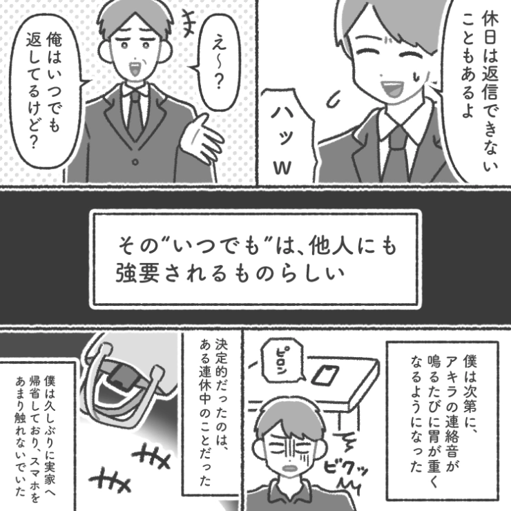 連休中に帰省している主人公にも容赦無く連絡してくる同僚。この後、主人公もさすがに我慢の限界に達して・・・。