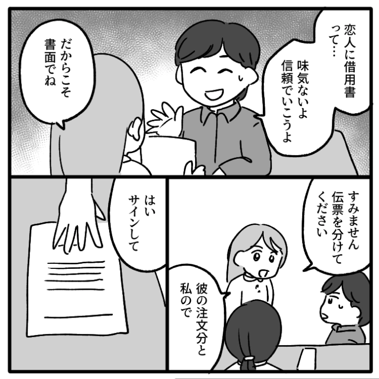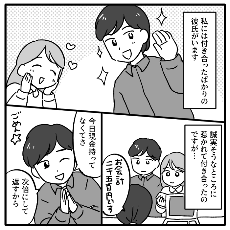 衝撃のエピソードを漫画化!今回はデートのたびに主人公にお金を全額支払わせて1円も返金しない彼氏のお話をご紹介します。