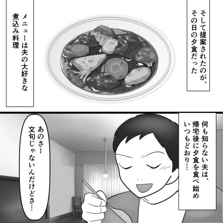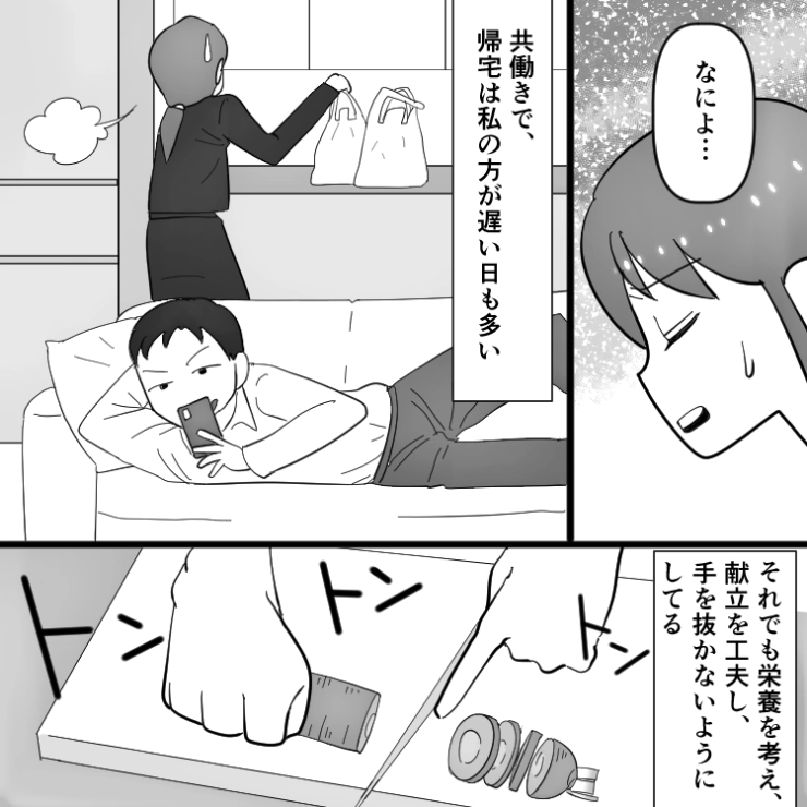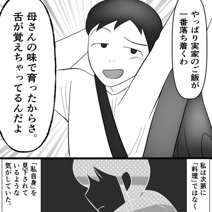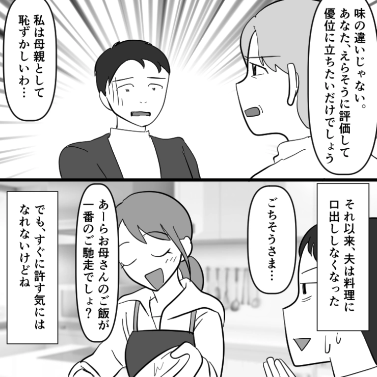 偉そうに評価だけしていた夫はこの日以降、主人公の料理に文句を言うことは一切なくなったのでした。