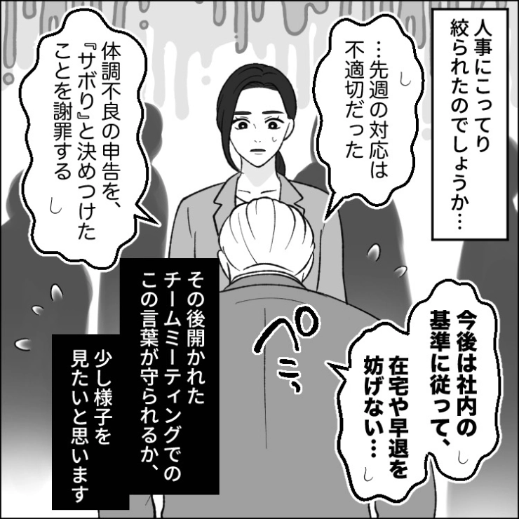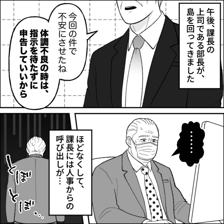 自分も体調を崩し、さらに人事部にデリカシーのない発言を咎められた上司はさすがに反省することとなったのでした。
