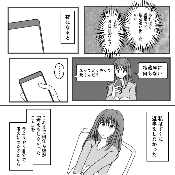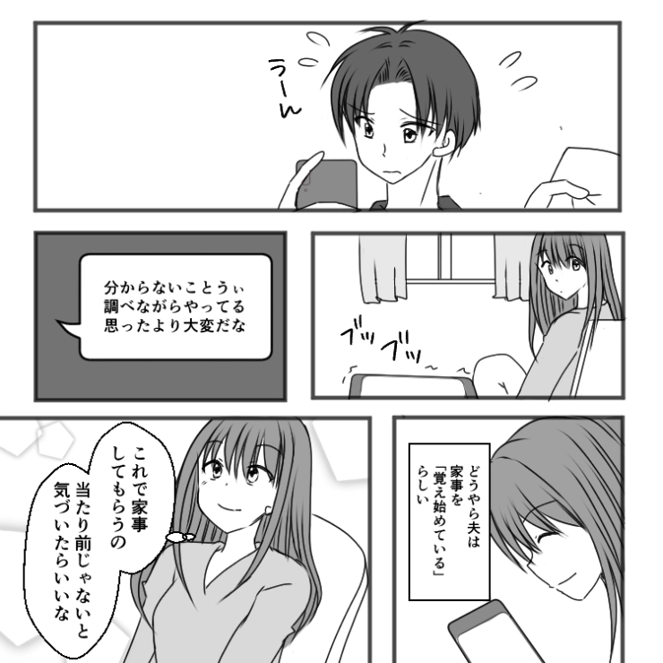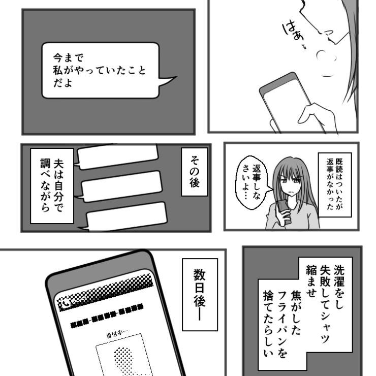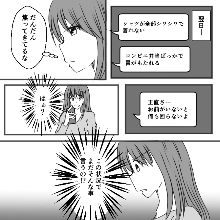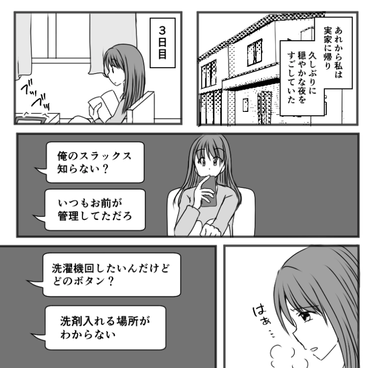 主人公がいなくなり、料理も洗濯も掃除も自分でやらなければならなくなった夫。これからは協力してほしいところです。