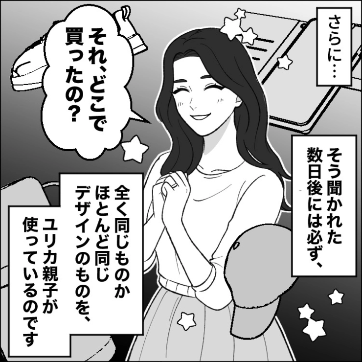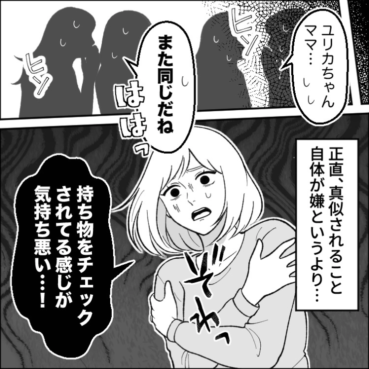 周りのママ友も異常に感じるぐらいなんでもお揃いにしてくるユリカちゃんママ。さすがに気持ち悪さを感じた主人公は・・・。