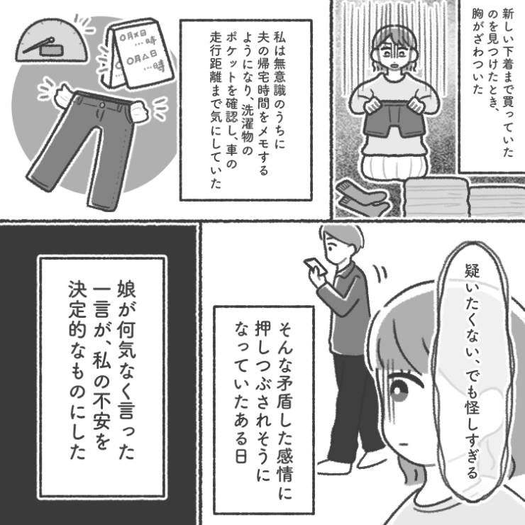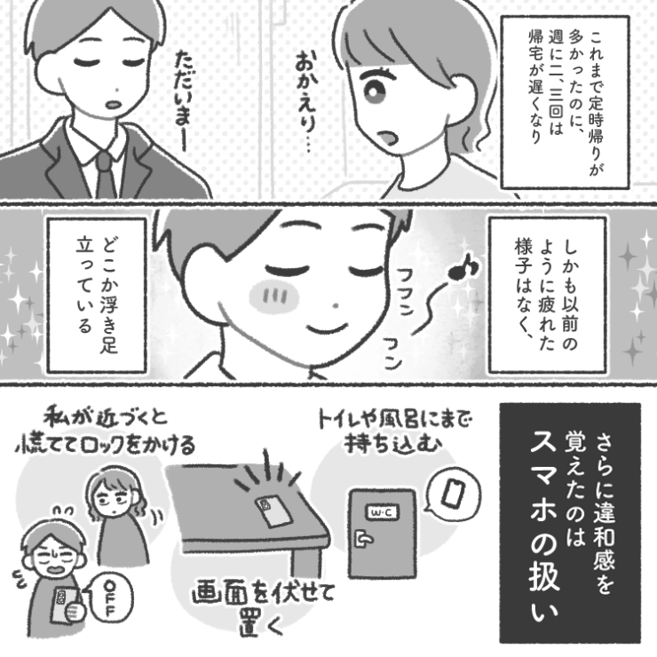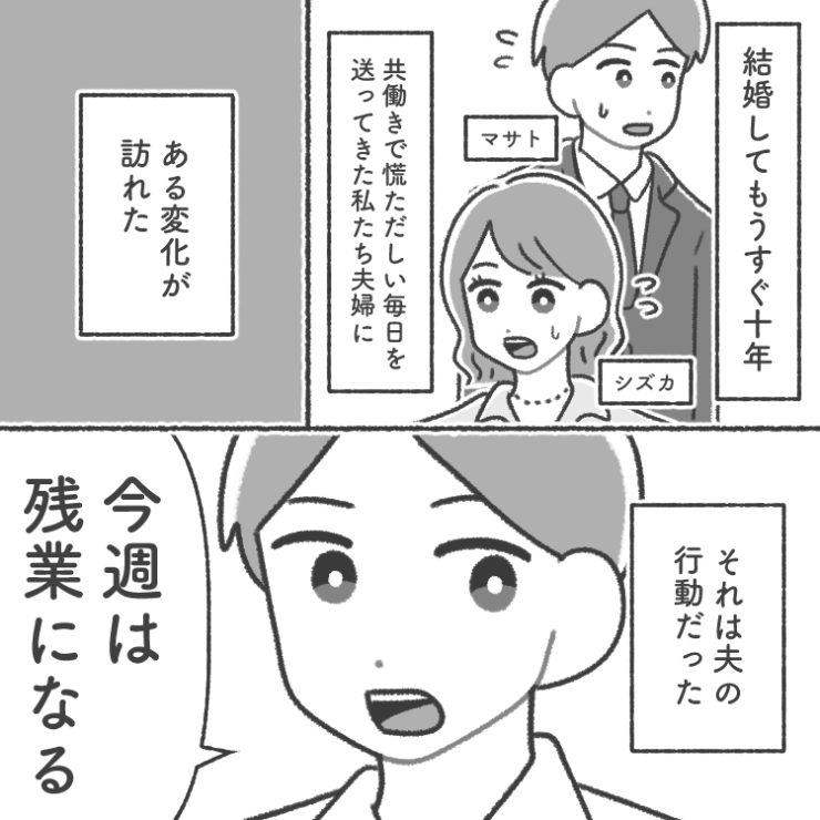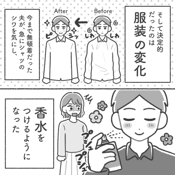 衝撃のエピソードを漫画化!今回はある日突然服装を気にしたり、帰りが遅くなったりと行動が怪しい夫のお話をご紹介します。
