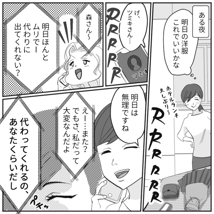 OTHER 2026.04.26「今日も私の代わりにシフト出てね〜」私が休みの日を狙ってシフトの交換を依頼する同僚!断ると不機嫌になる・替わってもお礼がないなど→舐められすぎてムカついたので・・・衝撃のエピソードを漫画化!今回は私が休みの日を狙って私にだけシフトの交換を依頼してくる同僚のお話をご紹介します。「私は子供がいて忙しい。独身は暇でしょ?」私が休みの日を狙ってシフトの交換を依頼する同僚!断ると不機嫌になる・替わってもお礼がないなど→舐められすぎてムカついたので・・・1234#漫画