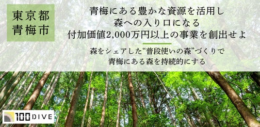 - 株式会社100DIVE(代表取締役CEO:庄司 弥寿彦)は、地域課題解決に向けた新たなローカルビジネス創出プロジェクト「100DIVE」10期を、東京都青梅市で開催いたします。なお、今回の10期は、身近な自然の魅力を案内して、現代人が失いつつある「心の豊かさ」や「生きる力」への気付きを提供することを目指している「一般社団法人森の演出家協会」と共催になります。