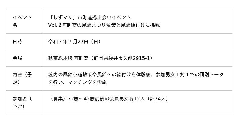 今回は、浜松市、磐田市、袋井市と連携し、可睡斎(袋井市)で婚活イベントを開催します。