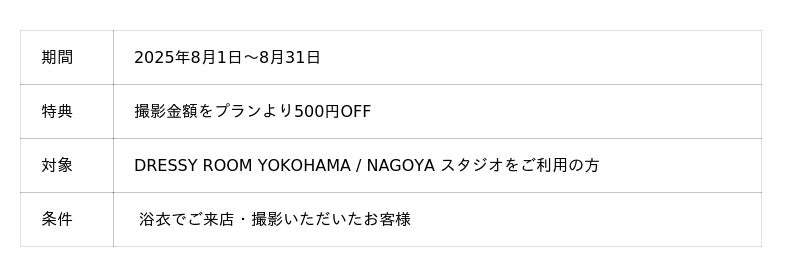セルフ写真館 PICmiiは、カメラ専門店「カメラのキタムラ」のグループ会社として、撮影画質の仕上がりにこだわったセルフ写真館で、個室での自由な撮影をお楽しみいただけます。DRESSY ROOM YOKOHAMA/NAGOYAスタジオでは、8月限定で『浴衣キャンペーン』を実施。花火や屋台、夏祭りが楽しいこの季節。 浴衣でご来店・撮影いただいたお客様には、撮影金額をプランより500円OFFにてご案内させていただきます。 夏の思い出を、涼やかな浴衣姿で残しませんか? ご家族やご友人、大切な人との特別な一枚をぜひこの機会に。※ご予約時またはご来店時に「キャンペーンの記事を見た」とお伝えください。