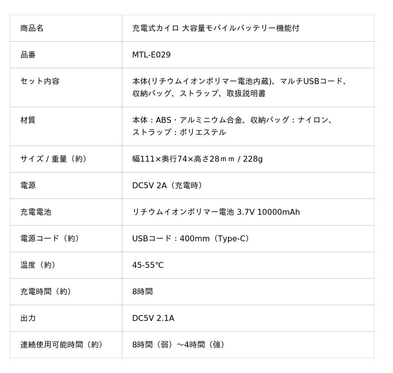 充電式カイロ 大容量モバイルバッテリー機能付 MTL-E029