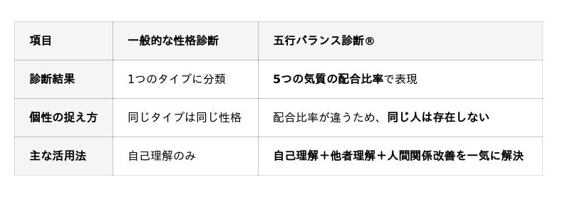 MBTIなど一般的な性格診断との違いは、以下の通りです。