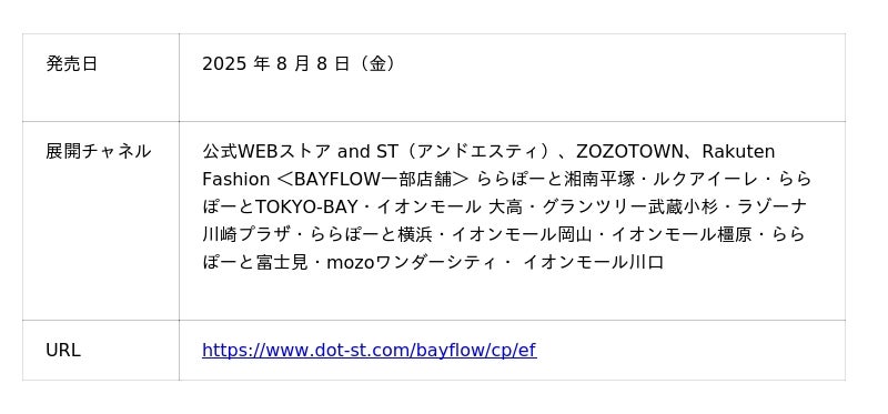 株式会社アダストリア(本部:東京都渋谷区渋谷 2-21-1、代表取締役社長:木村 治)が展開するライフスタイルブランド「BAYFLOW(ベイフロー)」より、オトナのための新ブランド「EF(エフ)」がデビューします。「EF」のアイテムは、2025 年8月8日(金)より、公式WEBストア and ST(アンドエステ ィ)、ZOZOTOWN、Rakuten Fashion、一部のBAYFLOW店舗にて発売いたします。