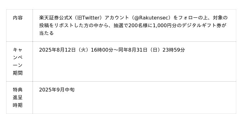 楽天証券は、「iSPEED(R)」1,000万ダウンロードを記念して、2025年8月12日(火)より、キャンペーンを開始しました。楽天証券で口座をお持ちでない方を含む、どなたでも参加可能で、楽天証券公式X(旧Twitter)アカウント(@Rakutensec)をフォローの上、対象の投稿をリポストした方の中から、抽選で200名様に1,000円分のデジタルギフト券が当たります。キャンペーン詳細は、楽天証券公式X(旧Twitter)アカウント(@Rakutensec)をご覧ください。