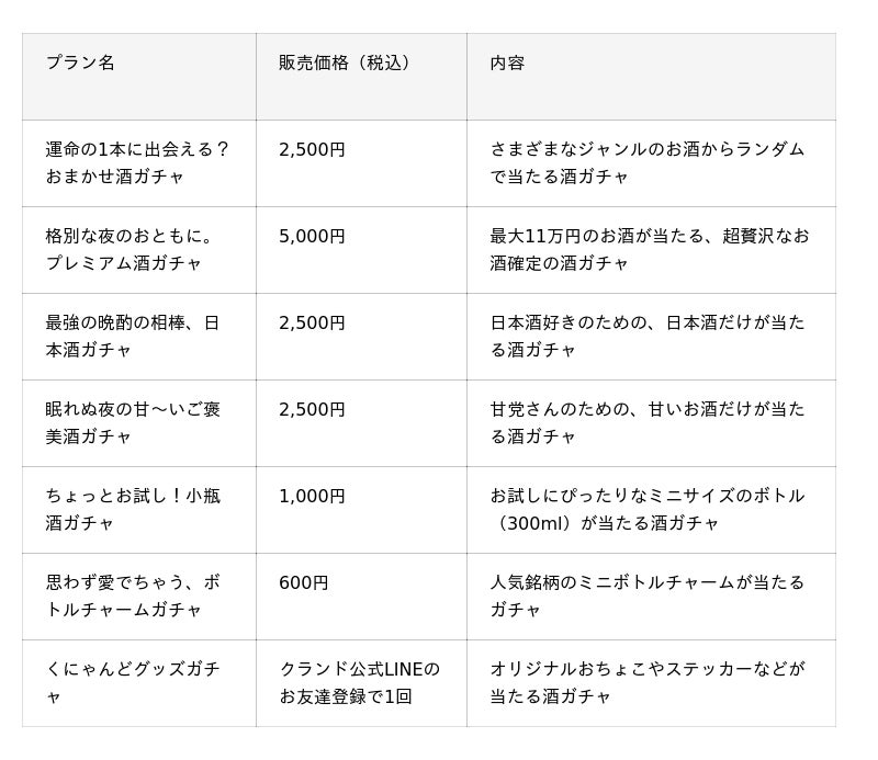 当たるお酒のラインアップには1本110,000円(税込)の、50年熟成酒粕焼酎「神響 shinkyo 50年」や、1本55,000円(税込)の30年熟成させた日本酒「天琥 -tenko- 30年」など、一般販売していないレアなお酒も入ります。他にもクランド公式LINEを友達登録すると回せる、「くにゃんどグッズガチャ」も登場します。