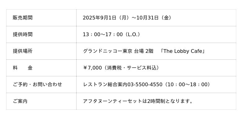 「東京を楽しむ 東京をくつろぐ」ひとときをお届けするグランドニッコー東京 台場(住所:東京都港区 総支配人:塚田 忠保)は、吹き抜けのロビーフロアに心地よい光が降り注ぐ「The Lobby Cafe」にて、旬の果実を堪能し尽くす『シャインマスカットアフタヌーンティーセット』を2025年9月1日(月)~10月31日(金)の期間限定で提供いたします。