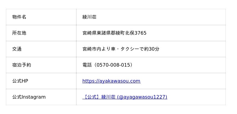 本取り組みは、綾川荘を中心に、綾町の自然と食の魅力を観光と結びつけて発信する新たな挑戦です。