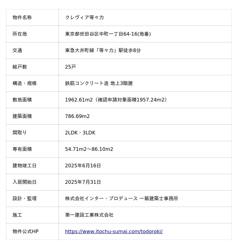 伊藤忠都市開発株式会社(本社:東京都港区、代表取締役社長:松 典男)は、新築分譲マンション「クレヴィア等々力」(東京都世田谷区、総戸数25戸)が2025年6月に竣工したことをお知らせいたします。