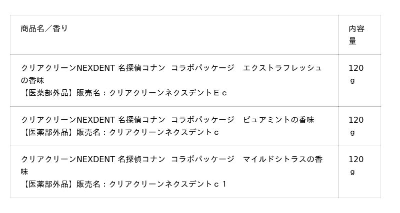 花王株式会社のオーラルケアブランド「クリアクリーン」は、テレビアニメ「名探偵コナン」とコラボレーションした「クリアクリーンNEXDENT」の3種(エクストラフレッシュの香味、ピュアミントの香味、マイルドシトラスの香味)の数量限定コラボパッケージを発売します。※2025年8月25日より出荷開始。