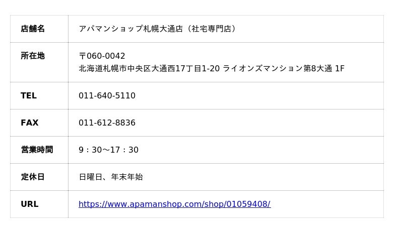 賃貸住宅仲介業店舗数No.1*のアパマンショップを展開するApaman Network株式会社(本社:東京都千代田区、代表取締役社長:山崎 戒/APAMAN株式会社の連結子会社)は、アパマンショップ加盟企業である株式会社NCK(本社:北海道札幌市)が、2025年8月20日(水)に法人向け社宅斡旋に特化した 「アパマンショップ札幌大通店(社宅専門店)」 を札幌市中央区・大通エリアに新規オープンしたことをお知らせいたします。
