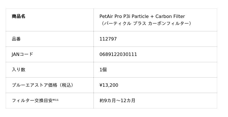 *²【試験機関】(株)エフシージー総合研究所【試験方法】JEM1467:2015「家庭用空気清浄機(附属書B 除臭性能試験)」に 基づきPetAir Pro P3iとBlue Max 3450iをそれぞれ最高スピードで測定。【試験結果】PetAir Pro P3iとBlue Max 3450iの30分後のアセトアルデヒドと生活臭除去率のそれぞれの除去率の比較結果(ペットのニオイは体臭の原因となるアセトアルデヒドを想定。生活臭は飲食後のアルコール、生ゴミ、トイレなどの原因となるアンモニア、アセトアルデヒド、酢酸を想定)。アセトアルデヒドの30分後のPetAir Pro P3iの除去率99.999%以上に対し、Blue Max 3450iは33.3%。30分後の生活臭除去率PetAir Pro P3iが99.999%以上に対し、Blue Max 3450iは60.4%。*密閉した試験空間での効果であり、実使用空間での実証結果ではありません。すべてのニオイを除去できるものではありません。周辺環境(湿度・温度)、運転時間、フィルターの使用期間、劣化状況により異なります。