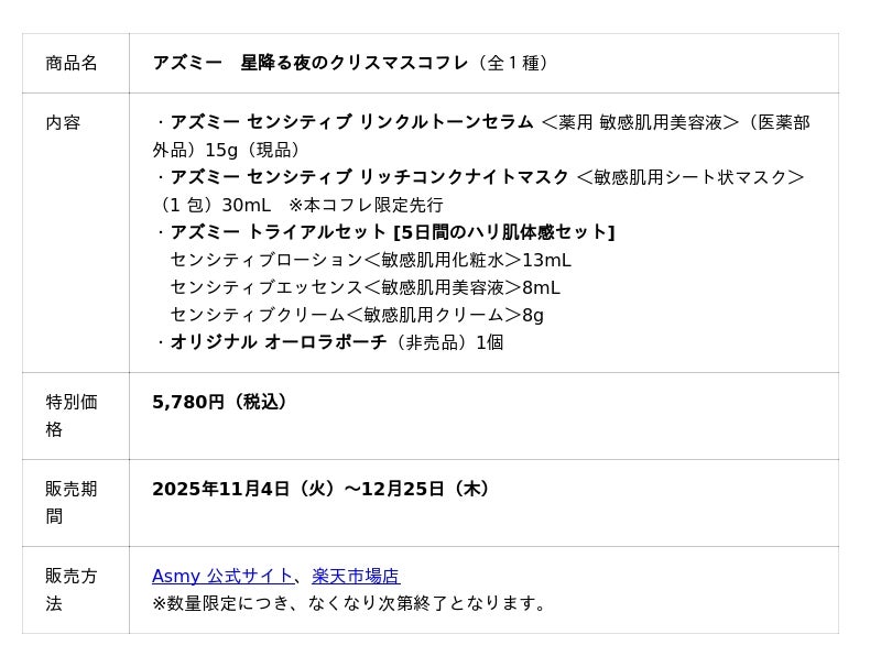 株式会社キナリ(本社:東京都品川区、取締役社長:山本 理史)が展開する敏感肌エイジングケア*¹ブランド「Asmy(アズミー)」は、ホリデーシーズンに向けて「アズミー 星降る夜のクリスマスコフレ」を2025年11月4日(火)より数量・期間限定で発売いたします。