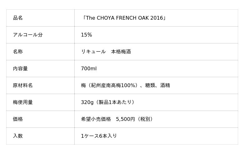 「The CHOYA FRENCH OAK 2016」は、2016年に収穫した和歌山県紀州産南高梅を、梅酒専用タンクで3年間熟成。その濃厚で芳醇な紀州産南高梅原酒を、“熟成樽”の最高峰と言われる「フレンチオーク樽」にてさらに2年以上追加熟成。合計5年以上の熟成期間を経て作り上げられた逸品です。