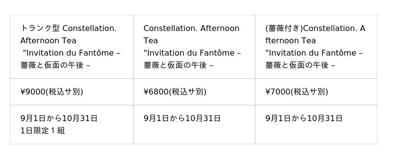 9・10月限定で、Constellation.では、ガストン・ルルー原作『オペラ座の怪人』にインスパイアされたアフタヌーンティーをご用意いたしました。