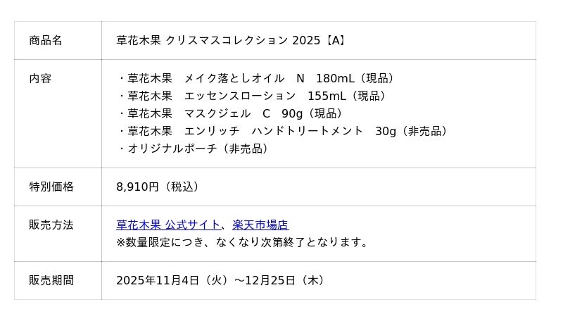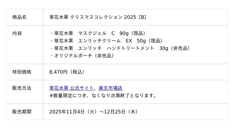 2025年の新作コレクションは、大人の毛穴悩みにアプローチしてつるんとなめらかな素肌にととのえる人気の美容液「草花木果 マスクジェル C」(現品)を中心に、落とすケアからうるおすケアまで<毛穴・ハリケア>の基本3品をシリーズで体感できる「草花木果 クリスマスコレクション 2025【A】」と、ハリ不足を集中的にケアする「草花木果 クリスマスコレクション 2025【B】」をご用意しました。