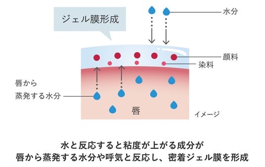 塗布後、ジェル状の膜を形成し唇の表面をコーティング。