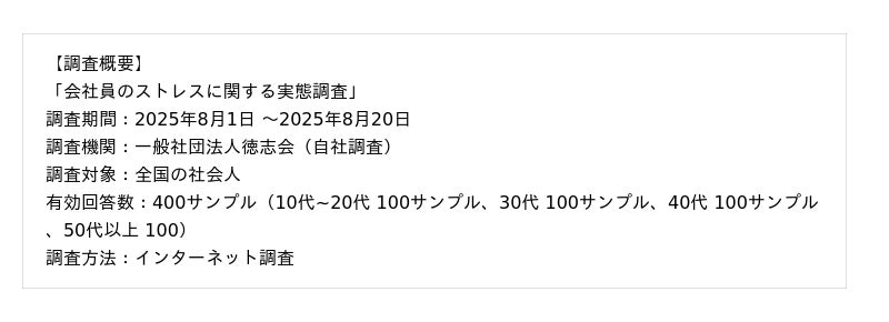 一般社団法人徳志会(代表理事:河口雅弘)は、心療内科・精神科クリニックである新宿心療内科よりそいメタルクリニック(新宿駅東口徒歩3分)横浜心療内科よりそいメタルクリニック(横浜駅西口徒歩2分)柏心療内科・精神科よりそいメンタルクリニック(柏駅徒歩0分、2025年10月オープン予定)を運営し皆様のメンタルヘルスをサポートしております。今回は会社員のストレスの実態に関する調査を実施したので、その結果を紹介します。