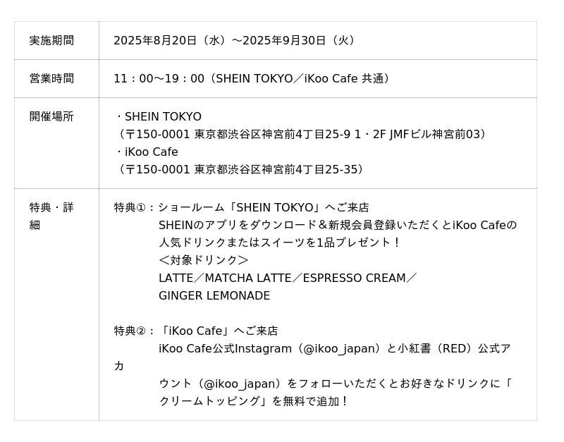 この度、「SHEIN」は、原宿に店舗を構える人気カフェ「iKoo Cafe(イコ―カフェ)」と夢のコラボレーションを実施いたします。東京・原宿に位置するショールーム「SHEIN TOKYO」にご来店いただき、SHEINのアプリをダウンロード&新規会員登録された方に「iKoo Cafe」の人気ドリンクまたはスイーツを1点プレゼント。さらに、「iKoo Cafe」ご来店時に公式SNSをフォローいただくと、追加特典もご用意しています。数量限定のため、先着順となります。ぜひこの機会にお越しください。