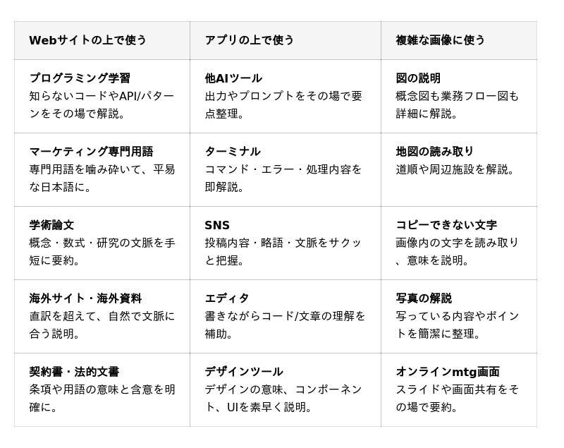 ウェブサイト、ドキュメント、アプリで出会った難しいテキストも、画像やグラフなどの視覚コンテンツも、範囲を選んですぐに解説されます。