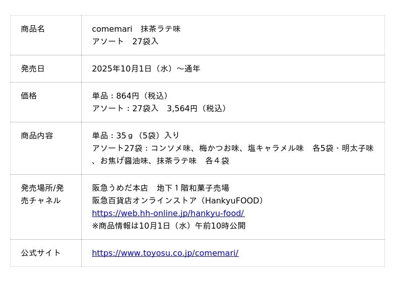 とよす株式会社(本社:大阪府池田市 社長:眞田 昌彦)は、阪急うめだ本店にて展開しているブランド、お米のスナック専門店「comemari」において、『抹茶ラテ味』を2025年10月1日(水)から発売いたします。