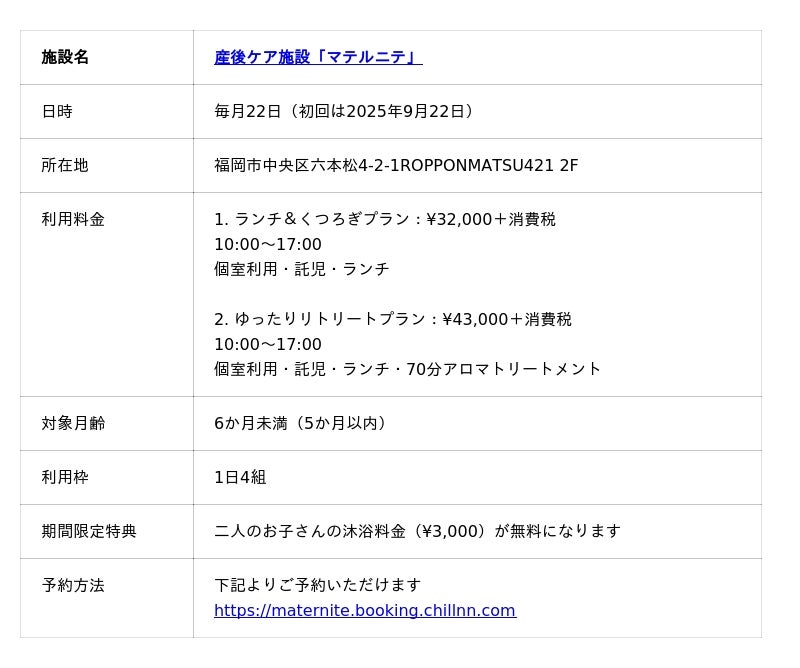 株式会社ミナト(代表取締役:村田 将春)は、福岡市中央区六本松にある産後ケア施設「マテルニテ」にて、ふたご(双胎)を育てる母親専用の新プラン「ふたごの休日」を2025年9月22日(月)より開始いたします。