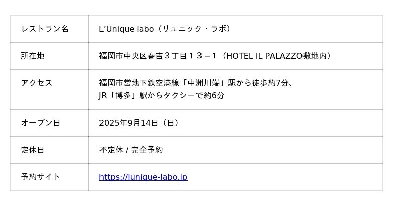 当社が保有し、「Re-Design」プロジェクトを経て、2023年にオープンした「ホテル イル・パラッツォ」(福岡県福岡市、 https://ilpalazzo.jp )のチャペル跡地に、本年9月14日(日)、フレンチレストラン「L’Unique labo(リュニック・ラボ)」がグランドオープンいたします。