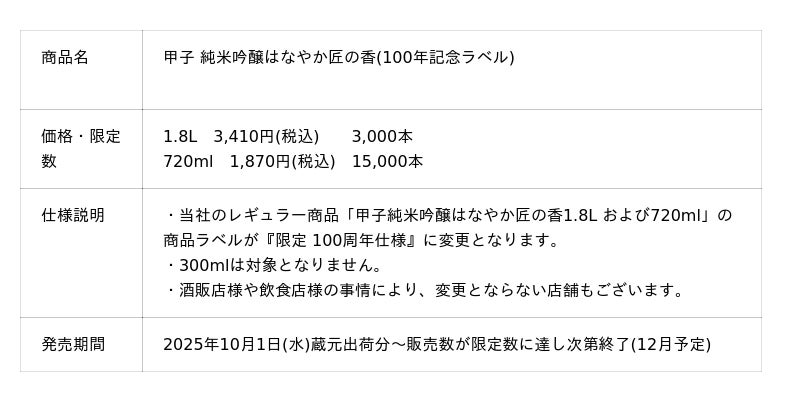 これを記念して、フラッグシップ商品「甲子 純米吟醸はなやか匠の香」を ”100周年記念ラベル”仕様に変更して数量限定にて発売いたします。
