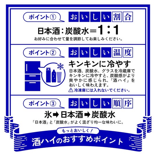 近年、日本酒を炭酸水で割る飲み方「酒ハイ」(SAKEハイ)が話題になっており、多様な楽しみ方のひとつとして広まりつつあります。日本酒の魅力を伝えたいメーカーと流通業者の任意団体「日本酒需要創造会議」(2024年発足、月桂冠もプロジェクトメンバーとして参加)では、「酒ハイ三原則」を定めてアピールするなど、日本酒の新たな登場シーンを増やす取り組みを行っています。