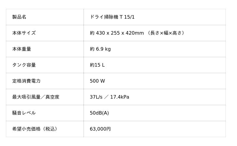 約50 dB(A)の静音性を実現した業務用ドライ掃除機「T 15/1」発売