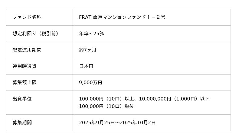 「未来をわかちあう投資」を提供する「Funvest(ファンベスト)」(以下、Funvest)は、「FRAT 亀戸マンションファンド1-2号」(以下、本ファンド)の募集を9/25より開始しますので、お知らせいたします。