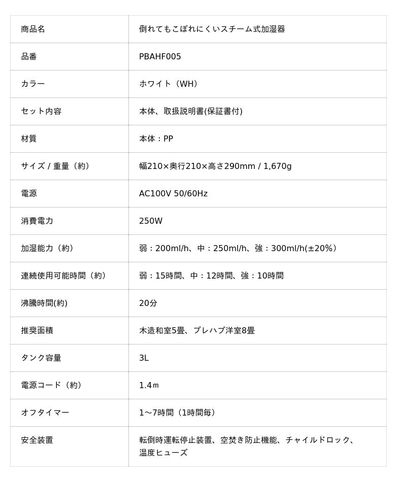 「倒れてもこぼれにくいスチーム式加湿器」 PBAHF005