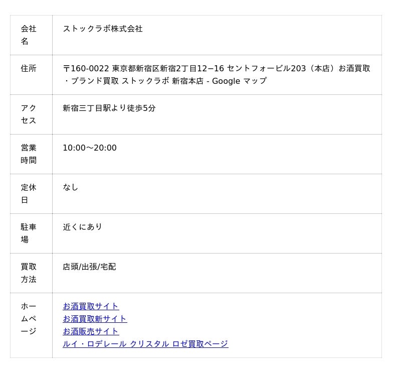 お酒買取専門店ストックラボのルイ・ロデレール クリスタル ロゼ買取の特徴を3つに分けて解説します。まずは、ストックラボの業者の概要をご確認ください。