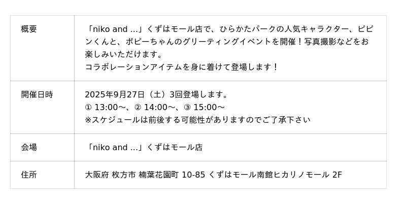 9月27日(土)には、「niko and ... 」くずはモール店にて、ひらかたパークの人気キャラクターピピンくんと、ポピーちゃんのグリーティングイベントを開催!